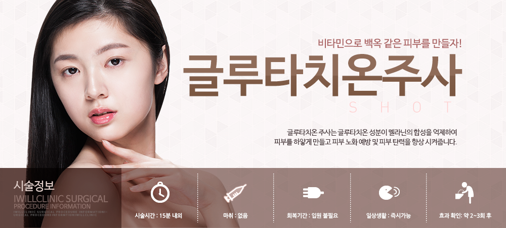 주름 방지와 탄력을 개선하기 위해 글루타치온 성분을 주사하기도 해요. 또한 자외선 등 바깥으로부터 파괴된 피부의 회복을 도와 피부의 노화 속도를 저하시키는 역할도 해요.