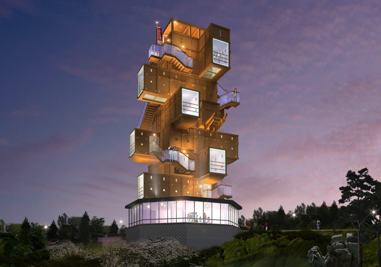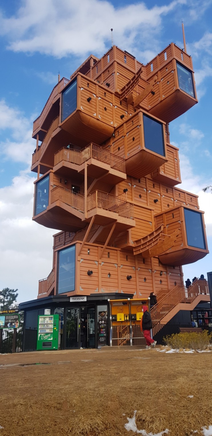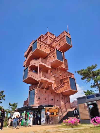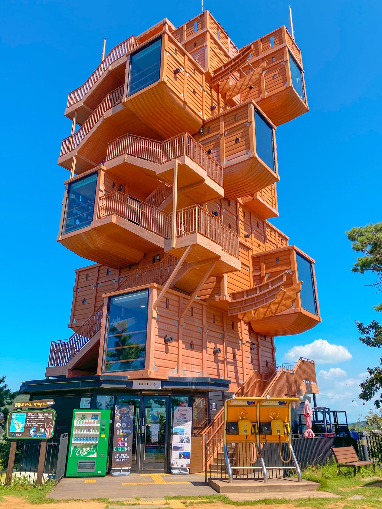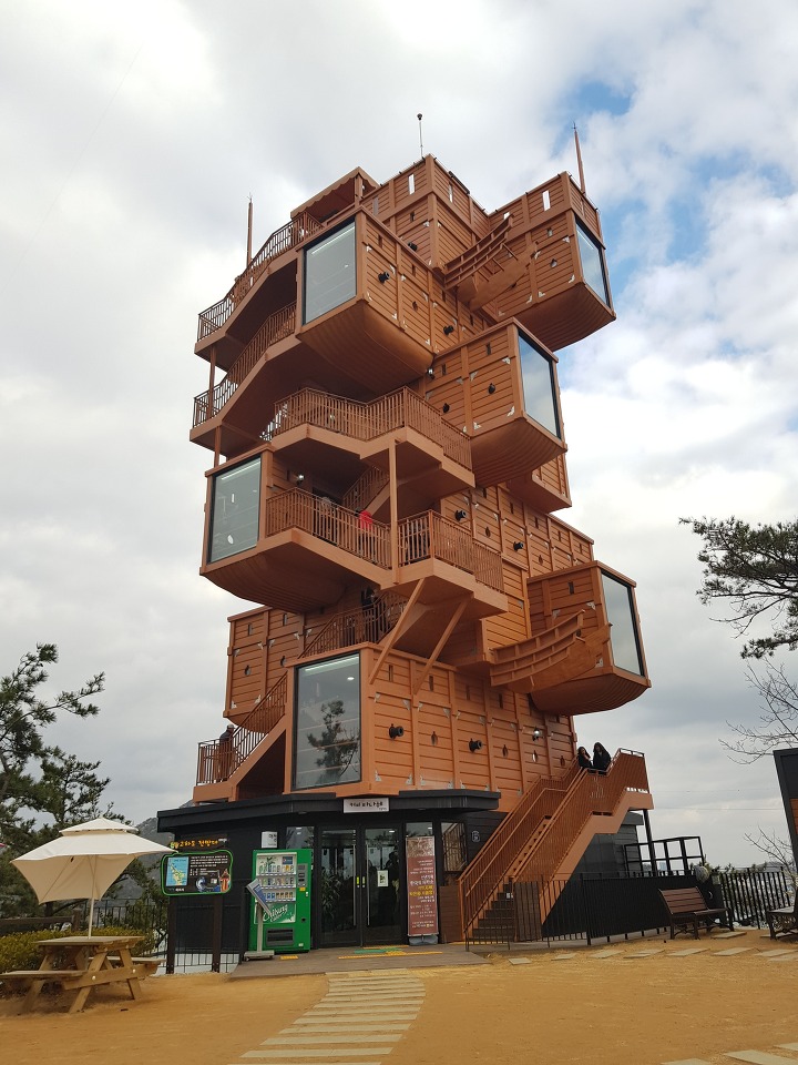 하지만 정상에 올라오면 이순신 장군이 명량대첩에서 승리 후 전열을 가다듬었던 고하도의 수려한 해상 풍광을 충무공의 얼을 담은 13척의 판옥선 모형을 격자형으로 쌓아 올린 전망대에서 감상할 수 있다고 하며 2층부터 5층까지는 전망대 또는 목포관광을 소개하는 전시 공간이고 5층 전망대는 사방이 탁 트인 구조로 되어있어요. 이에더해 한쪽에는 판옥선의 지붕 같은 주조물이 있어 비나 뜨거운 햇빛을 피해서 구경할 수 있어요.