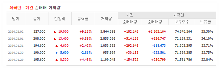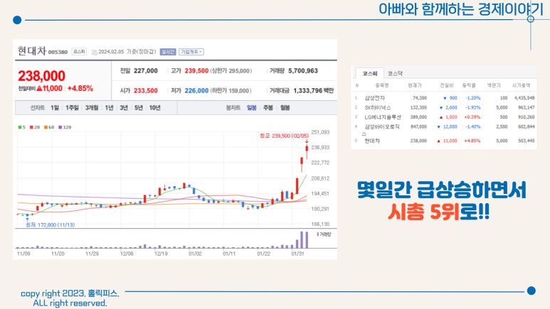 22년부터 외인 비중이 늘면서 현대차 주가 흐름이 좋게 이어져오다가, 최근 며칠 기관이 매수에 참여하면서 급등하고 있어요. (24년 2월 5일 기준)
