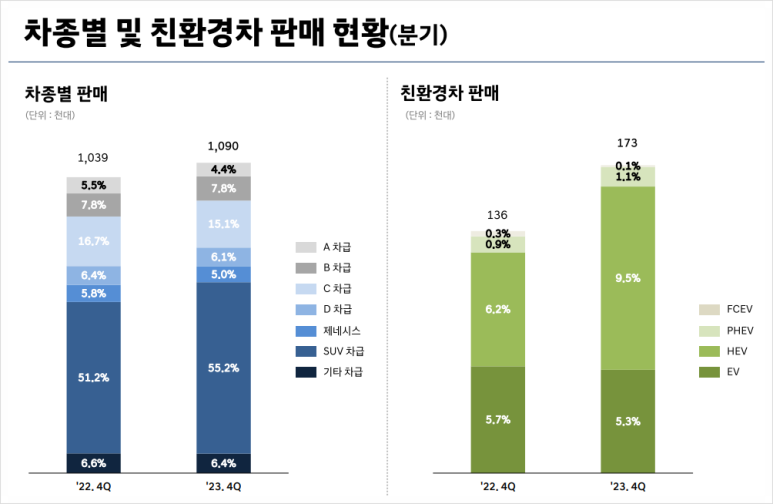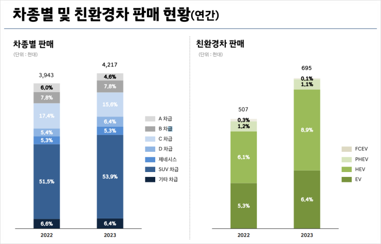 2023년 한 해 동안 전기차 26만 8785대, 하이브리드 37만 3941대를 포함해 전년보다 37.2% 늘어난 69만 5382대의 친환경차가 글로벌 시장에서 인기를 이어갔어요.