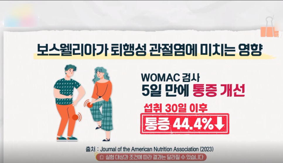 WOMAC(워맥)이라는 퇴행성 관절염에 가장 많이 사용하는 평가 지표가 있는데 관절염으로 통증을 겪는 사람들에게 섭취하게 한 후 WOMAC검사를 진행을 해봤더니 5일 만에 통증이 개선되고 섭취 30일 이후부터는 통증이 44.4%나 감소했다는 연구 결과도 있어요. 뿐 아니라 뻣뻣함도 66.3%나 감소했고 신체 기능도 44.4%나 개선되었다고 해요.
