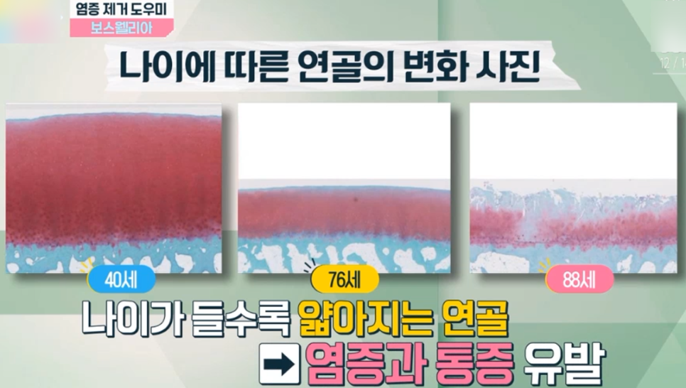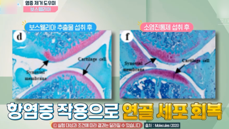관절에 염증이 발생하다 보면 연골을 분해하는 효소들이 증가하면서 연골조직을 파괴하게 돼요. 염증을 억제하게되면 연골 조직 파괴를 막을 수 있는데 실제로 동물실험에서 관절염을 일으킨 연골세포에 보스웰리아추출물을 투여했더니 염증 유발 물질이 억제되는 효과를 나타냈고 연골 세포 생존율도 증가한 것으로 나타났어요