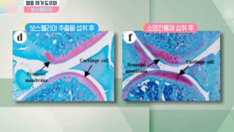 실제 연구에서 관절염이 있는 쥐에게 3주간 한쪽은 보스웰리아 추출물 등 복합물을 섭취하게 해주고 다른 한쪽은 소염진통제를 섭취하게 한 뒤에 비교를 해봤는데 둘 다 비슷하게 연골 세포가 차올랐는데 양쪽 모두 항염증 작용을 하여 연골 세포를 어느 정도 회복시킨 걸 볼 수 있어요. 보스웰리아추출물등 복합물이 소염진통제와 유사한 염증 울질 증가를 감소시키고 연골 손상을 낮춰서 관절염을 개선하는 데 도움을 준다는 연구 결과도 있어요.