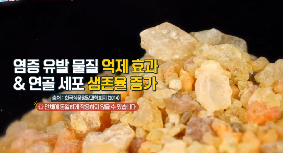 보스웰리아는 현대에 와서도 관절에 도움이 되는 식품으로 인정을 받고 있는데 우리나라 식품의약품안전처에서는 관절 건강의 핵심인 염증 억제와 연골보호를 동시에 관리하는 것으로 인정을 받았고 미국 국립보건원에서도 관절 건강에 소재로 소개할 정도로 관절염 예방과 관리에 도움을 주는 식품으로 알려져 있어요.
