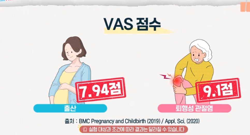보통 사람이 느끼는 전반적인 통증을 점수화하여 수치한 VAS라는 점수가 있는데 인간이 겪는 가장 큰 고통이라고 말하는 출산의 경우 바스 점수가 7.94점인데 관절염은 이보다 큰 9.1점으로 그만큼 극심한 통증을 동반하는 질환인데 통증을 개선하는 데도 도움을 줄 수 있어요.