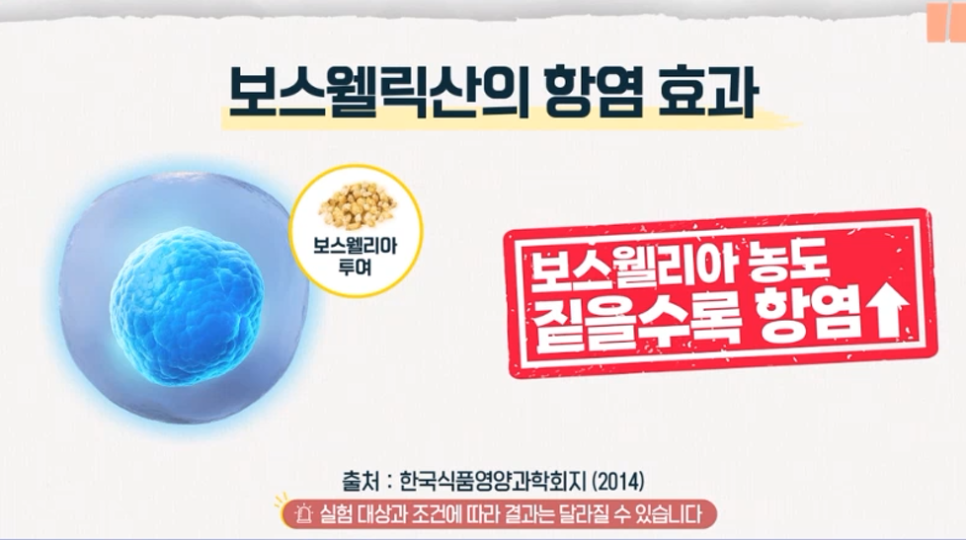실제로 염증세포를 배양하여 보스웰리아를 투여하고 3주간 상태를 지켜봤는데 농도가 짙어질수록 항염 효과가 높게 나타났다는 연구 결과도 있어요.